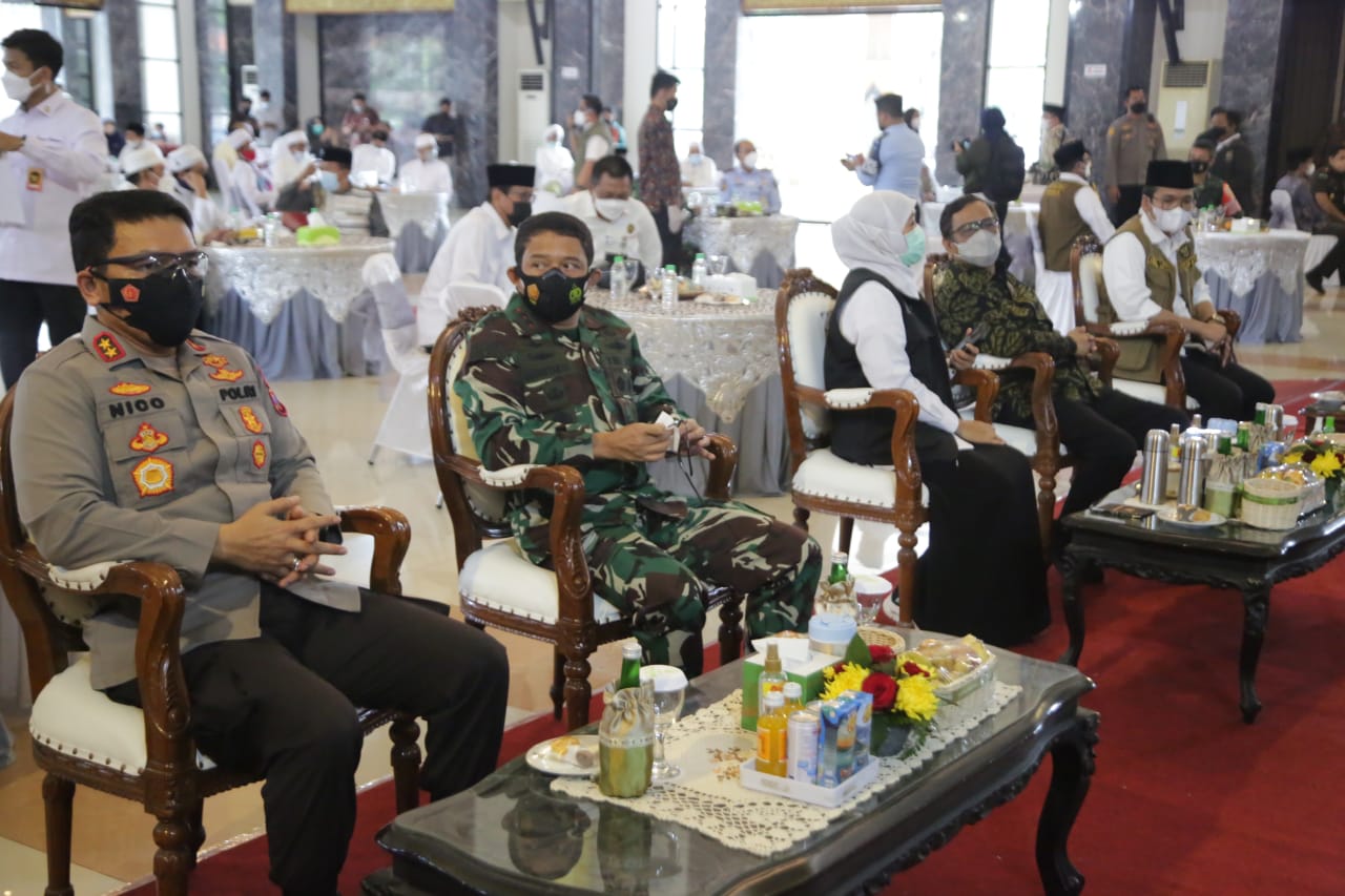 MASPOLIN || SURABAYA,- Forkopimda Jawa Timur, Gubernur Khofifah Indar Parawansa, Pangdam V Brawijaya Pangdam V Brawijaya Mayjen TNI Suharyanto, Kapolda Jatim Irjen Pol Nico Afinta, Selasa (15/6/2021) siang, mendampingi Prof. Dr. Mohammad Mahfud, Menteri Koordinator Politik Hukum dan Keamanan (Menkopolhukam) RI. Melaksanakan dialog bersama Forkopimda, tokoh agama dan tokoh masyarakat di Gedung Rato Ebuh, Kabupaten Bangkalan, Madura. Terkait antisipasi dan penanganan Covid-19.