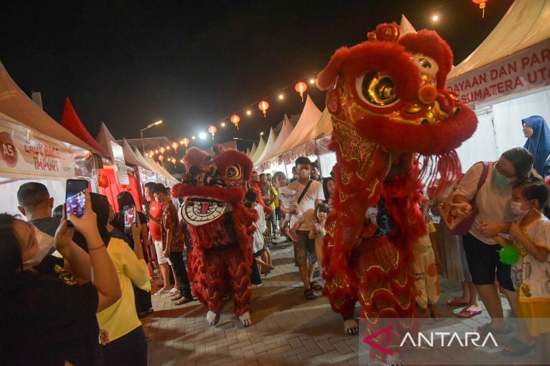 Warga Tionghoa menyaksikan atraksi barongsai saat mengunjungi Festival Imlek Fair 2023 di Medan, Sumatera Utara, Sabtu (14/1/2023). Festival tersebut menyajikan bazar dan sejumlah atraksi budaya Tionghoa untuk menyambut Tahun Baru Imlek 2574. ANTARA FOTO/Fransisco Carolio/pras.Warga Tionghoa memberikan angpao saat mengunjungi Festival Imlek Fair 2023 di Medan, Sumatera Utara, Sabtu (14/1/2023). Festival tersebut menyajikan bazar dan sejumlah atraksi budaya Tionghoa untuk menyambut Tahun Baru Imlek 2574. ANTARA FOTO/Fransisco Carolio/pras.Warga Tionghoa berswafoto saat mengunjungi Festival Imlek Fair 2023 di Medan, Sumatera Utara, Sabtu (14/1/2023). Festival tersebut menyajikan bazar dan sejumlah atraksi budaya Tionghoa untuk menyambut Tahun Baru Imlek 2574. ANTARA FOTO/Fransisco Carolio/pras.