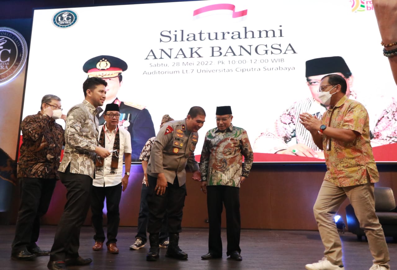 maspolin.id, Surabaya – Wakapolda Jawa Timur Brigjen Pol Slamet Hadi Supraptoyo menjadi narasumber bersama Dewan Pembina Rumah Bhinneka KH. Said Aqil Siraj dan Wakil Gubernur Jatim Emil Elistianto Dardak dalam silaturahmi anak bangsa yang diselenggarakan oleh Roemah Bhinneka, di Universitas Ciputra Surabaya, pada Sabtu (28/5/2022).