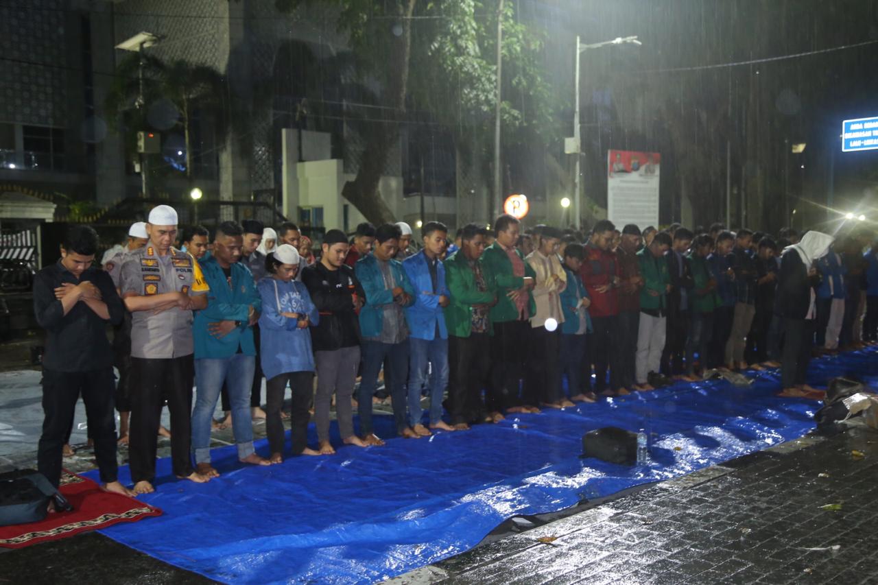 Tampak Kapolrestabes Medan dengan Personel Polrestabes Medan diikuti Aliansi Mahasiswa Sumatera Utara mempersiapkan diri, meski situasi diguyur hujan, namun, tetap melaksanakan Sholat maghrib dengan khusuk.