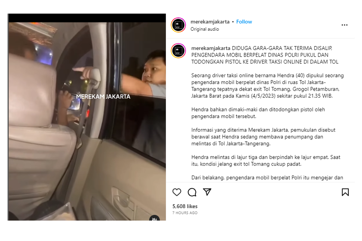 Terlihat pula sepucuk senjata yang dipegang oleh pengemudi tersebut ketika menghampiri dan memukul korban. “Plat Nopol dr Polda metro jaya @kapoldametrojaya Wajib di Cari Manusia yg pegang Senjata nya Musti di periksa , saya sangat Yakin sm Pak Kapolda Metro baru …bsk pastii dah ketemu orgnya,” tulis Sahroni dalam keterangan unggahannya, dikutip Kompas.com, Jumat.