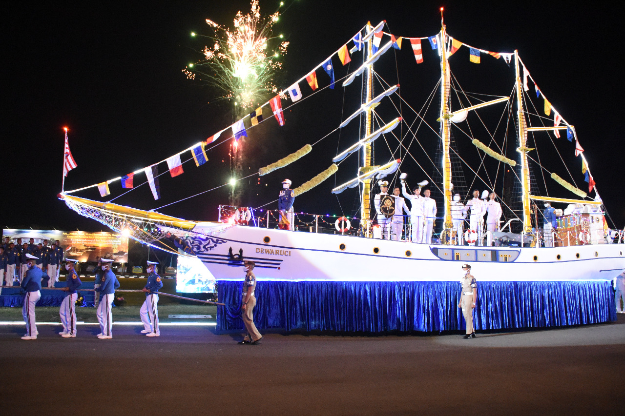 MASPOLIN || Surabaya – Mockap KRI Dewaruci, mewarnai pelepasan Perwira Remaja (Paja) Lulusan Akademi Angkatan Laut (AAL) Angkatan Ke-65 menuju ketempat penugasan perdana, AAL menyelenggarakan tradisi Peluncuran Perwira Remaja ini di lapangan Banda, Mako AAL Bumimoro, Surabaya, tadi malam.