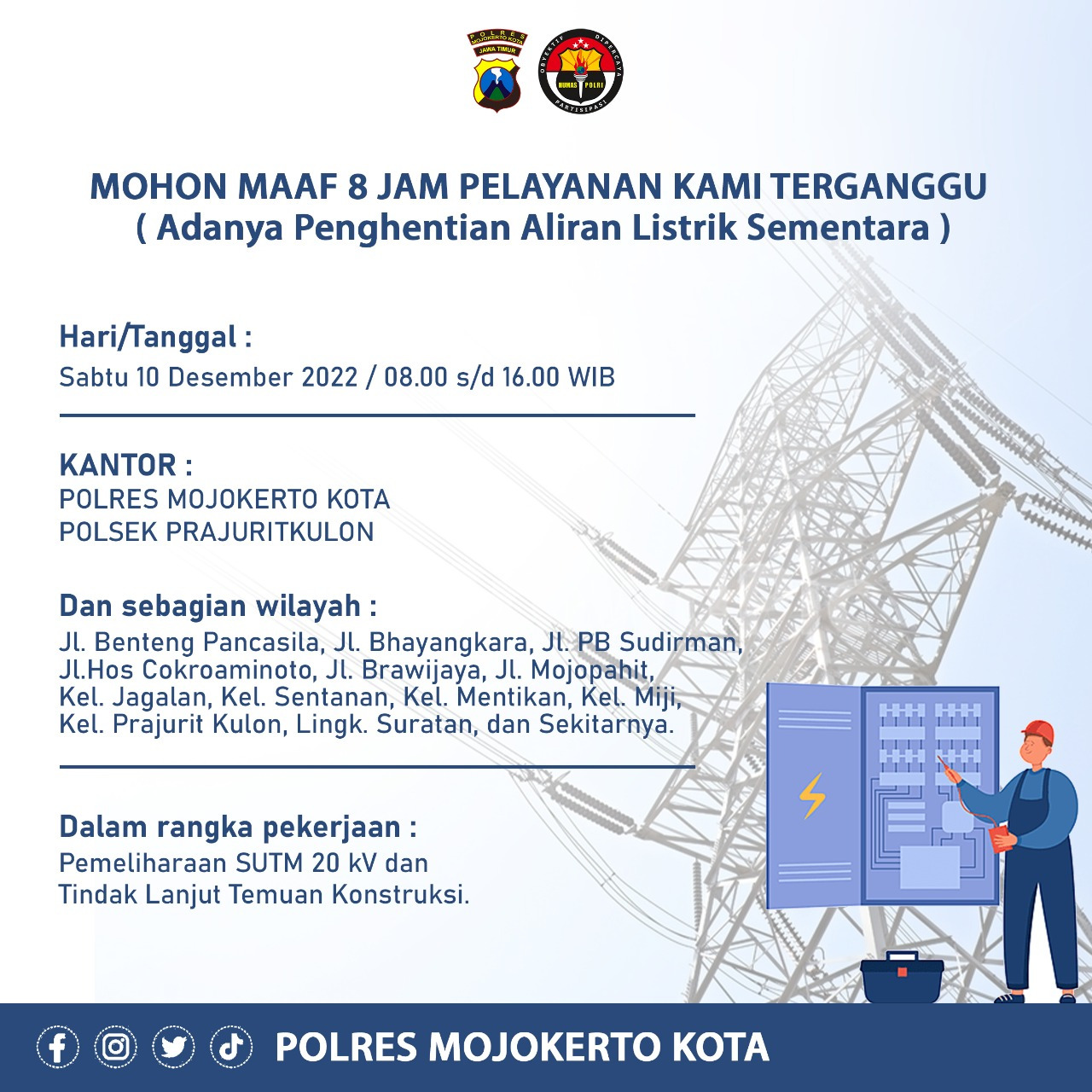 Mojokerto Kota – Maspolin.id|| Gangguan Pelayanan Publik dari Polresta Mojokerto Polda Jatim dan wilayah hukum Polsek Prajuritkulon besuk hari Sabtu tanggal 9 Desember 2022 mulai pukul 08.00 wib sampai dengan 16.00 wib akibat dmpak penghentian aliran listrik.