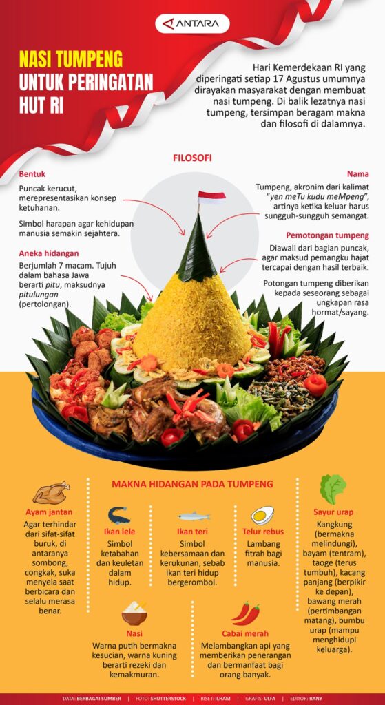 Hari Kemerdekaan RI yang diperingati setiap 17 Agustus umumnya dirayakan masyarakat dengan membuat nasi tumpeng. Di balik lezatnya nasi tumpeng, tersimpan beragam makna dan filosofi di dalamnya.