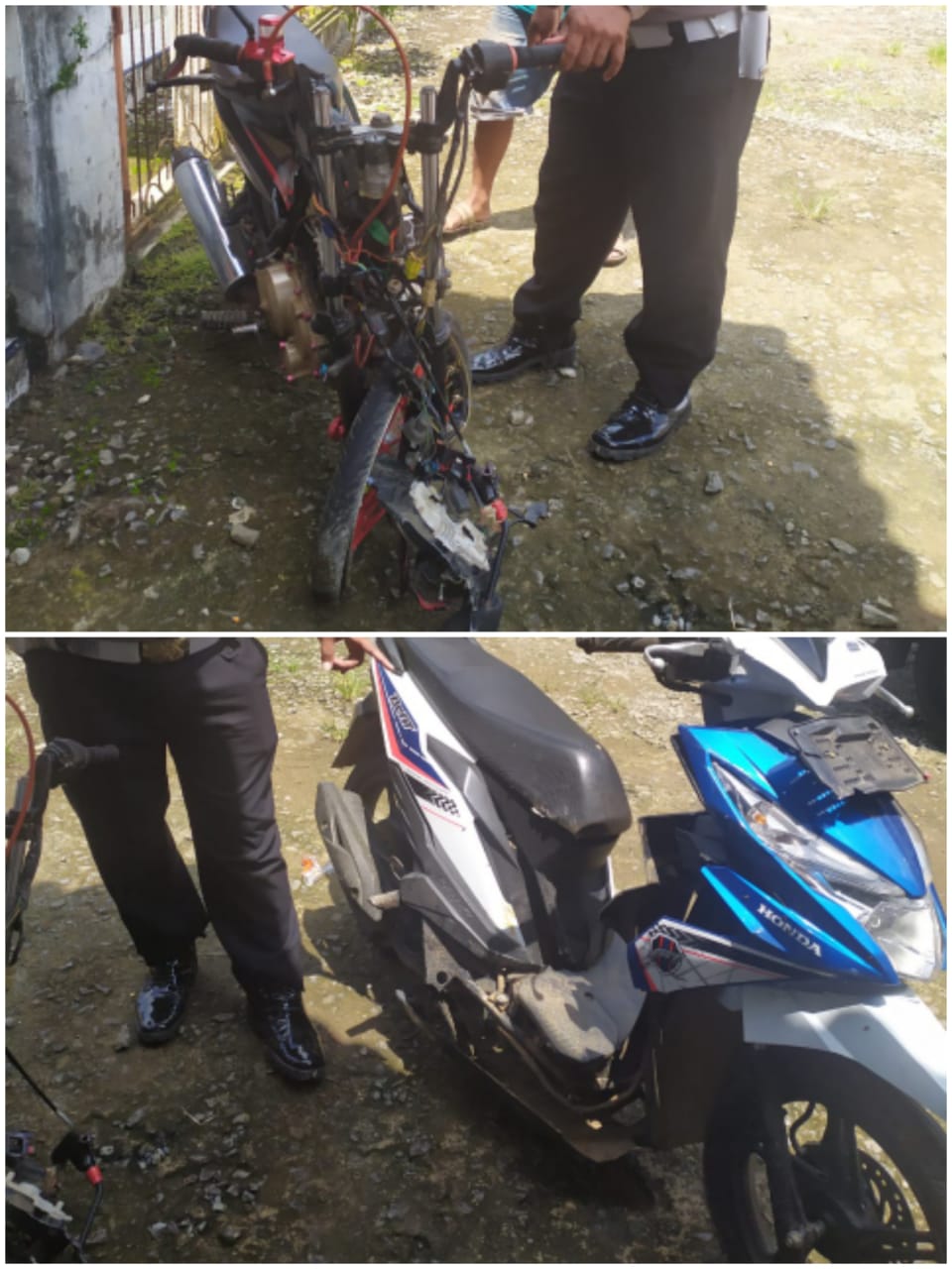 MASPOLIN || Kabupaten Pandeglang (Banten) – Dua unit sepeda notor terlibat saling tabrak alias adu banteng di Cibaliung, Pandeglang (Banten). Kedua pengendara pun mengalami luka berat dan luka ringan.