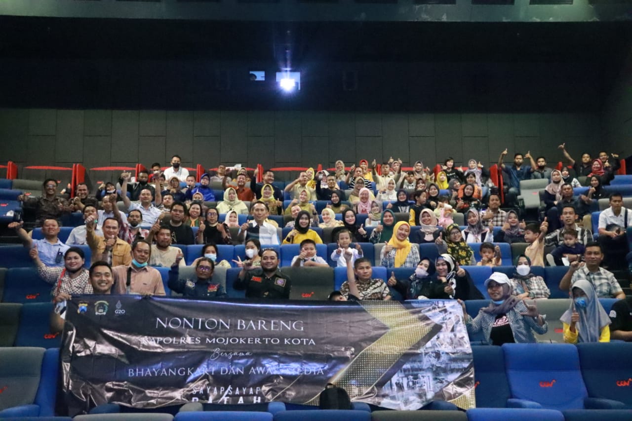 Mojokerto – Maspolin.id || Mempererat tali silatuhrahmi bersama Media, Kapolresta Mojokerto AKBP Wiwit Adisaria S.H., S.I.K., M.T., bersama Pejabat Umum, Bhayangkari, dan Polwan gelar PIRAMIDA bersama awak Media sekaligus Nobar (Nonton Bareng) film Sayap-Sayap Patah di CGV Cinemas Sunrise Mall Lantai 3 Jalan Benteng Pancasila No. 9, Kecamatan Magersari, Kota Mojokerto. Rabu (31/09/2022)