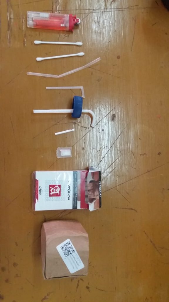1 (satu) bungkus kotak Rokok Sampoerna Yang Berisi 7 (tujuh) Batang Rokok, dan 1 (satu) Buah Tutup Botol Aqua Serta 1 (satu) Buah Pipet Terpasang Dilobang Tutup Botol, 2 (dua) Buah Pipet Yang Sudah Dibentuk.