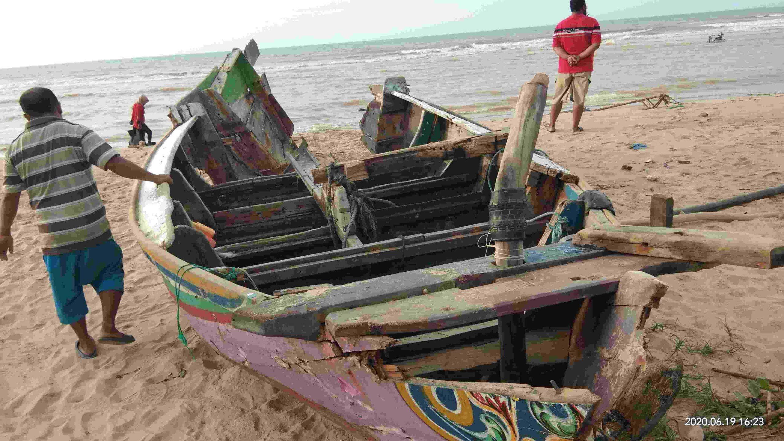 Tuban,maspolin.id Perahu Nelayan kecil milik Pak Suntono warga Desa: Gadon Kecamatan:Tambakboyo Kabupaten: Tuban,Jawa Timur pecah dihantam ombak setinggi 2,5 meter.Jumat (19/6/2020) ucap Kang Mus