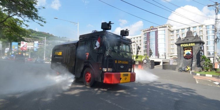 Semarang,Maspolin.id – Untuk mencegah penularan wabah virus corona yang mulai merebak di kota Semarang, Satuan Brimob Polda Jateng bersama Dit Samapta menyemprotkan cairan desinfektan di jalanan protokol kota Semarang. (25/03).