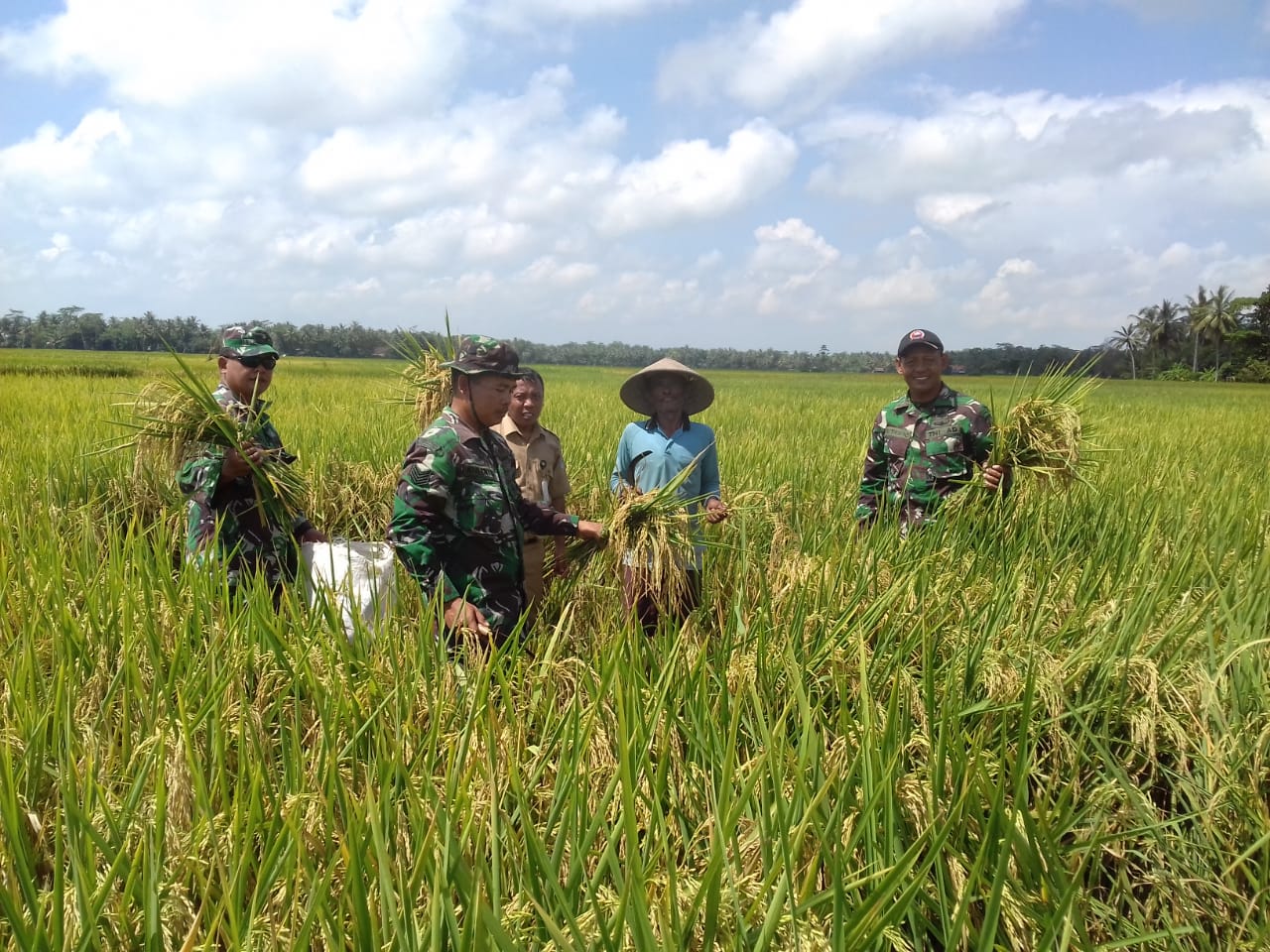 Serma Kusento mengatakan, pihaknya bersama Babinsa yang lain dan PPL mendampingi Kelompok Tani “Tani Mulyo” untuk memanen padi di Desa Layensari.