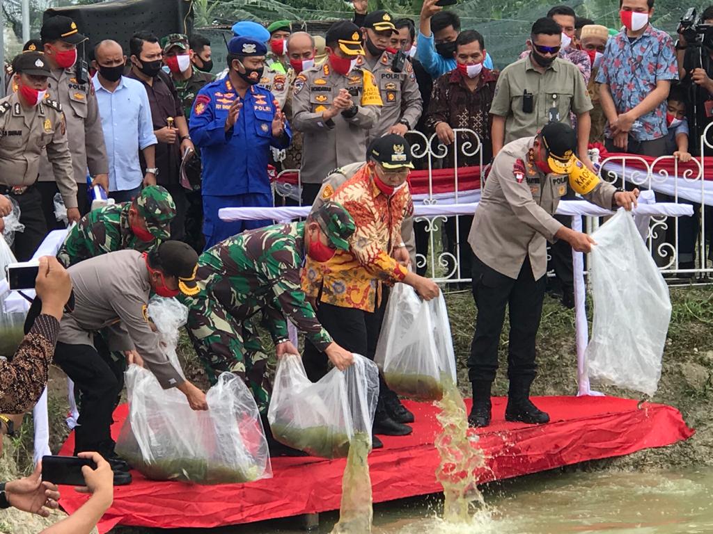 Dikesempatan itu juga Kapolda Sumut melaksanakan panen 17 ton ikan patin, menabur 50 ribu bibit ikan serta memberikan 1 ton pakan ikan dan 25 ribu bibit ikan kepada plasma peternak ikan guna meningkatkan ketahanan pangan dan meningkatkan perekonimian bagi masyarakat yang terdampak Covid-19 di wilayah Serdang Bedagai. Tutup Kapen.