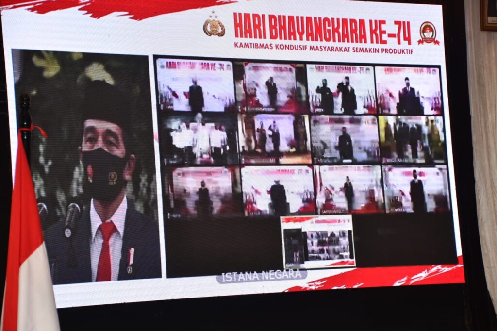 Sementara, upacara peringatan di Istana Negara dipimpin langsung oleh Presiden RI Joko Widodo dimana peringatan Hari Bhayangkara ke 74 tahun ini mengusung tema “Kamtibmas Kondusif Masyarakat Semakin Produktif”