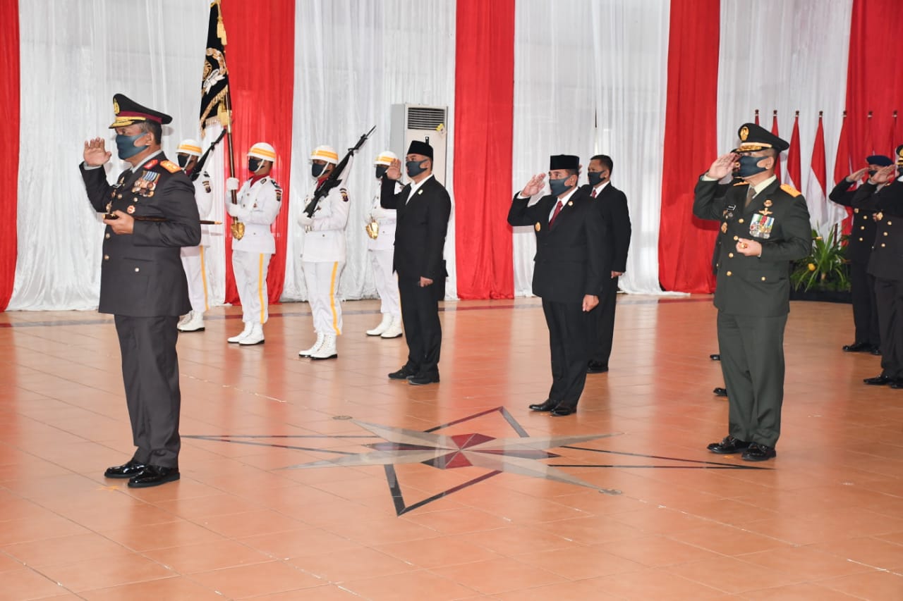 Medan, Maspolin.id—Pangdam I/BB Mayjen TNI Irwansyah menghadiri upacara peringatan Hari Bhayangkara ke 74 tahun 2020, secara sederhana dan live streaming dengan Istana Negara, Upacara kali ini hanya diikuti pejabat tertentu yang dilakukan diruang tertutup yakni di aula Tribrata Mapolda Sumut, Rabu (1/7/2020)