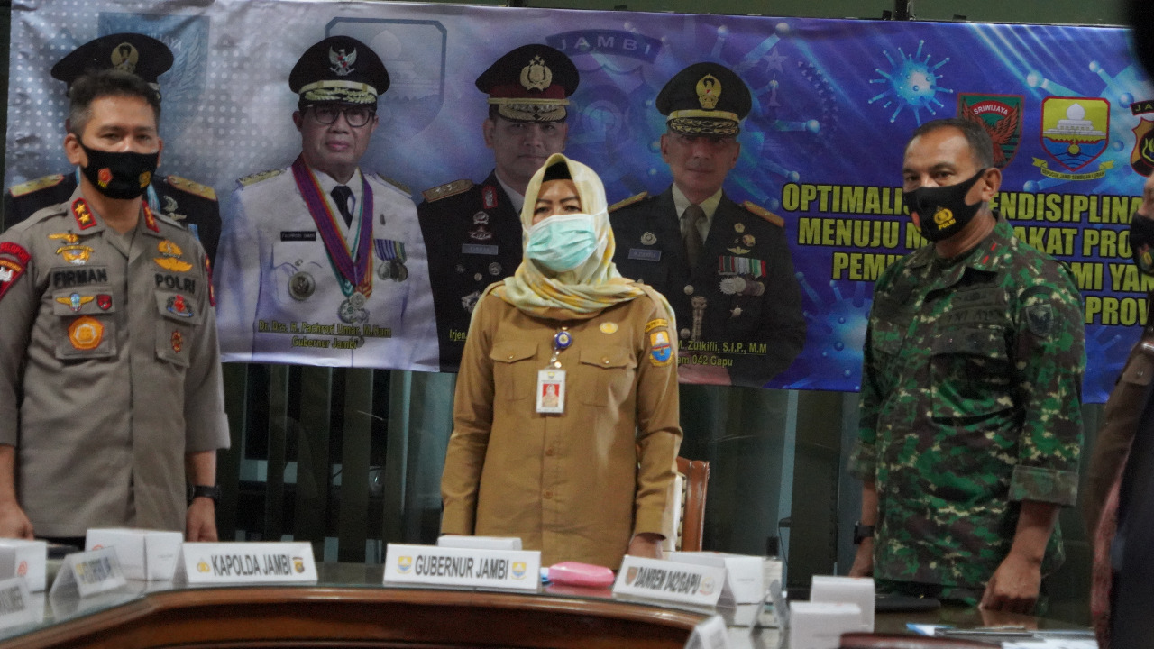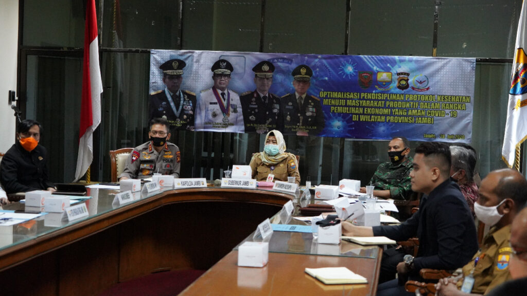 Webinar Optimalisasi Pendisiplinan Protokol Kesehatan Menuju Masyarakat Priduktif dalam Rangka Pemulihan Ekonomi Yang Aman Covid-19 diwilayah Provinsi Jambi,dihadiri oleh Forkompinda Prov Jambi antara lain Gubernur Jambi diwakili Staf ahli Gubernur bidang Ekonomi dan Pembangunan Ir.Hj.Sri Anggunaini, M.Si, Danrem 042/Gapu Brigjen TNI M. Zulkifli, S.I.P, M.M, Ketua DPRD Prov Jambi Edy Purwanto, Kajati Jambi Yudhi Sutoto, SH dan Ketua Pengadilan Tinggi Jambi Dr. Robinson Tarigan, S.H., M.H.