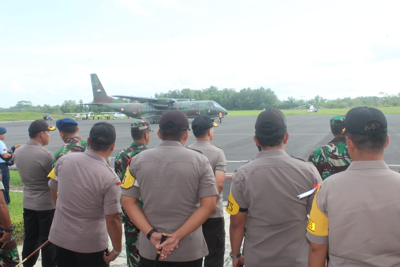 Selanjutnya, tepat pukul 15.25 WIB pesawat udara milik TNI AU jenis CN 295 No A 2908 dan CN 295 No A 2907 yang membawa Panglima TNI dan rombongan bertolak dari Bandara Tunggul Wulung menuju wilayah Kabupaten Cirebon. (Estanto)
