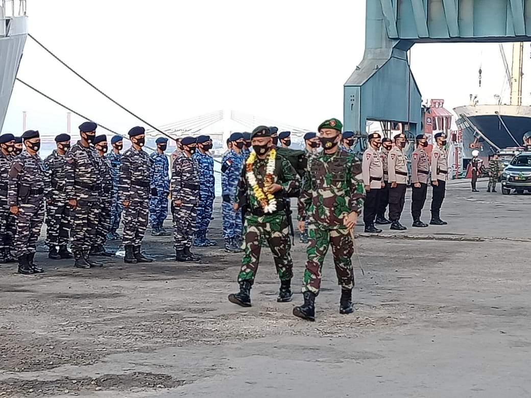Jambi, Maspolin.id—Pangdam II Sriwijaya Mayjen TNI Agus Suhardi, menyambut kedatangan personel Satgas Yonif Raider 142/Ksatria Jaya usai menjalankan tugas Operasi Pengamanan Perbatasan (Pamtas) Republik Indonesia– Republik Demokratik Timor Leste (RI-RDTL). Kedatangan personel Satgas Pamtas dilakukan melalui upacara militer di Lapangan Upacara Dermaga Boom Baru, Palembang, Minggu (23/8/2020) pagi.