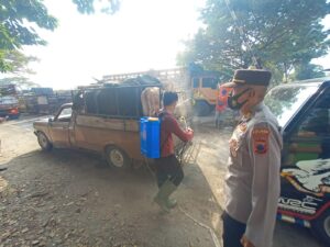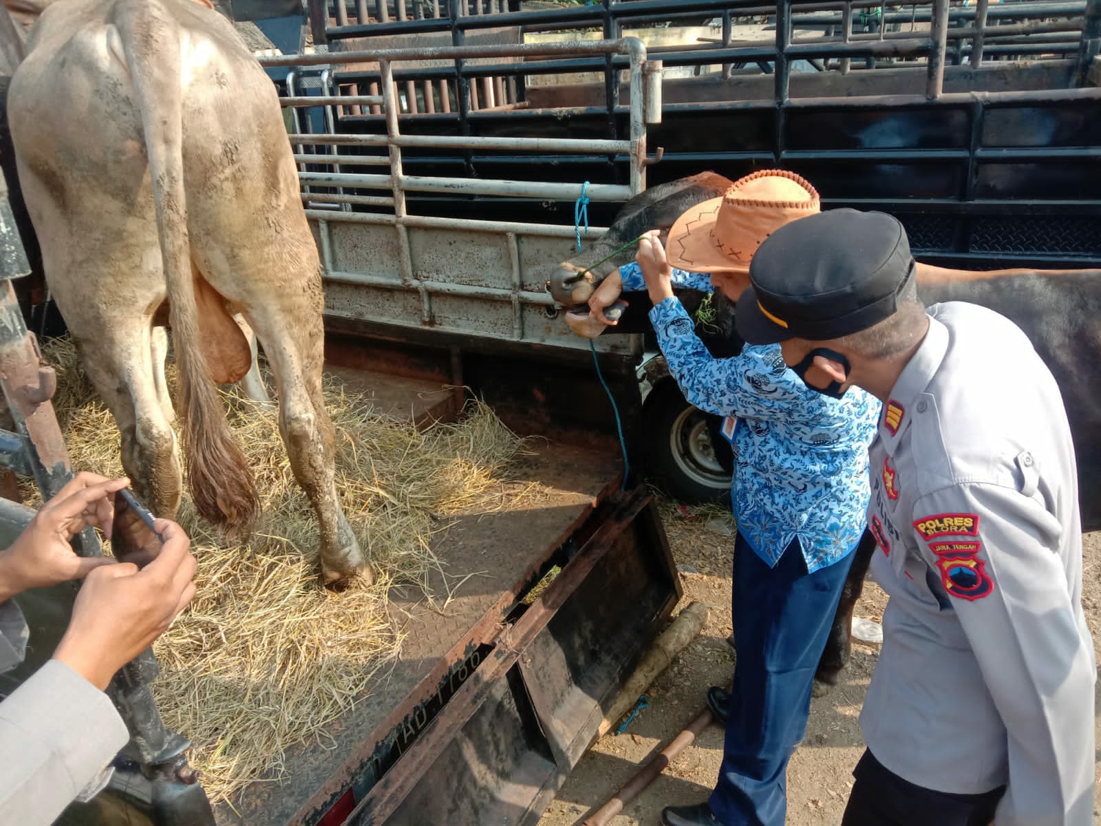 Dalam kegiatan tersebut, petugas gabungan melakukan penyemprotan disinfektan pada kendaraan yang digunakan untuk mengangkut hewan ternak yang akan diperjualbelikan.