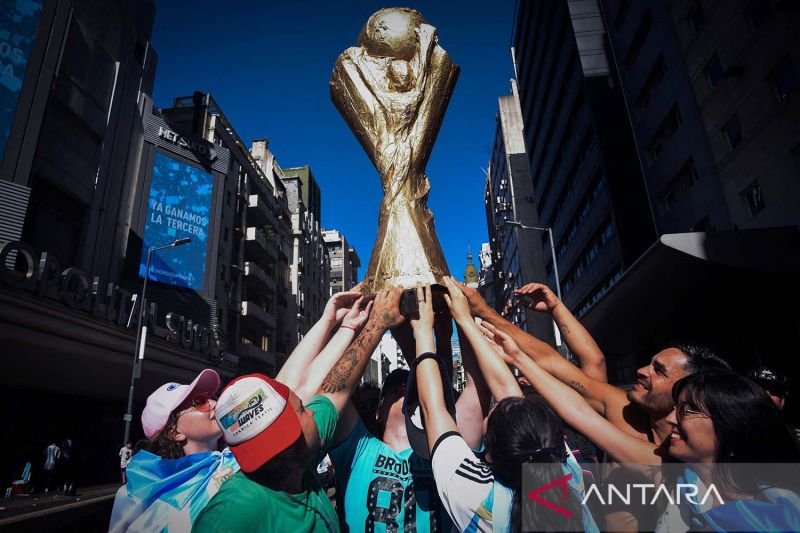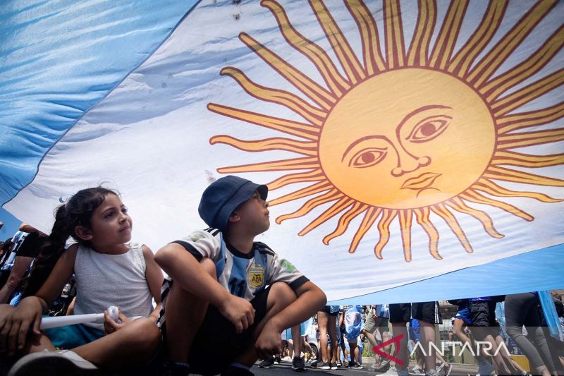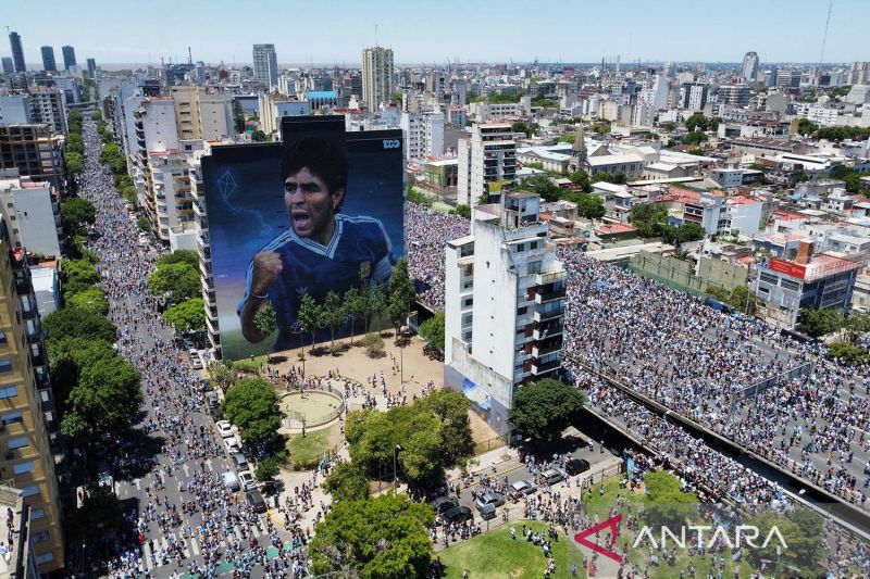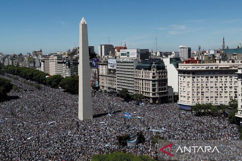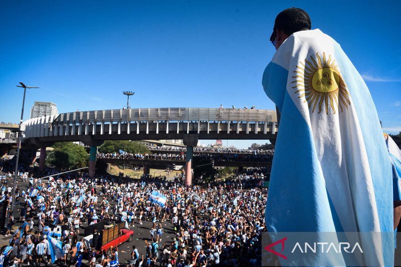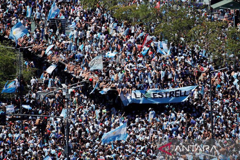 Suasana jutaan pendukung Argentina memenuhi kawasan ikon kota Obelisco saat parade kemenangan Argentina yang berhasil merebut gelar juara Piala Dunia 2022 di Buenos Aires, Argentina (20/12/2022). ANTARA FOTO/REUTERS/Agustin Marcarian/aww.Mural bergambar Diego Maradona terpajang di antara jutaan pendukung Argentina saat parade kemenangan Argentina yang berhasil merebut gelar juara Piala Dunia 2022 di Buenos Aires, Argentina (20/12/2022). ANTARA FOTO/REUTERS/Agustin Marcarian/aww.Sejumlah warga mengikuti parade kemenangan Argentina yang berhasil merebut gelar juara Piala Dunia 2022 di Buenos Aires, Argentina (20/12/2022). ANTARA FOTO/REUTERS/Agustin Marcarian/aww.Pemain Argentina Lionel Messi, Angel Di Maria dan rekan setimnya berdiri di atas bus dengan mengangkat trofi Piala Dunia 2022 saat parade kemenangan Argentina yang berhasil merebut gelar juara Piala Dunia 2022 di Buenos Aires, Argentina (20/12/2022). ANTARA FOTO/REUTERS/Martin Villar/aww.Sejumlah warga mengikuti parade kemenangan Argentina yang berhasil merebut gelar juara Piala Dunia 2022 di Buenos Aires, Argentina (20/12/2022). ANTARA FOTO/REUTERS/Mariana Nedelcu/aww.Sejumlah warga mengangkat replika trofi Piala Dunia saat parade kemenangan Argentina yang berhasil merebut gelar juara Piala Dunia 2022 di Buenos Aires, Argentina (20/12/2022). ANTARA FOTO/REUTERS/Mariana Nedelcu/aww.Dua bocah mengikuti parade kemenangan Argentina yang berhasil merebut gelar juara Piala Dunia 2022 di Buenos Aires, Argentina (20/12/2022). ANTARA FOTO/REUTERS/Mariana Nedelcu/aww.