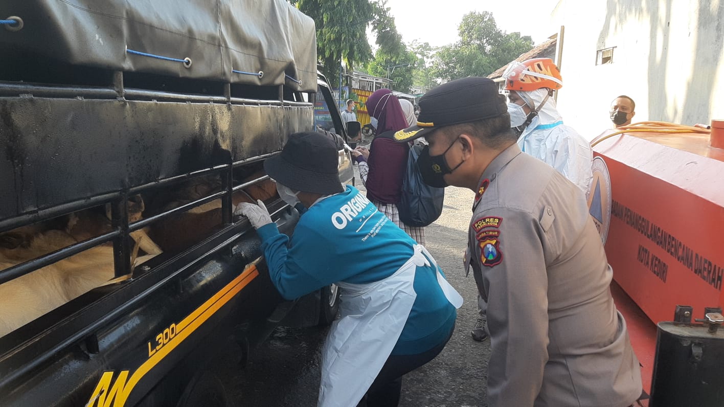 “Polres Kediri Kota menerjunkan personel Kepolisian untuk membantu petugas DKPP selama rangkaian proses pengecekan hewan ternak di pasar Hewan PD Joyoboyo Kota Kediri,” kata Kompol Abraham Sissik.
