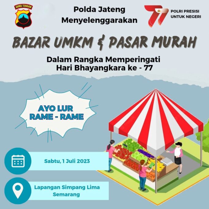 SEMARANG – Maspolin.id || Menjelang Hari Ulang Tahun Bhayangkara ke 77 tiba pada tanggal 1 Juli 2023 mendatang, Polda Jateng bakal gelar perayaan sangat meriah di kawasan Simpang Lima, Kota Semarang. Tak hanya menggelar upacara, Polda Jateng juga akan menggelar kirab kebangsaan, pameran UMKM serta bazaar pasar murah sembako.