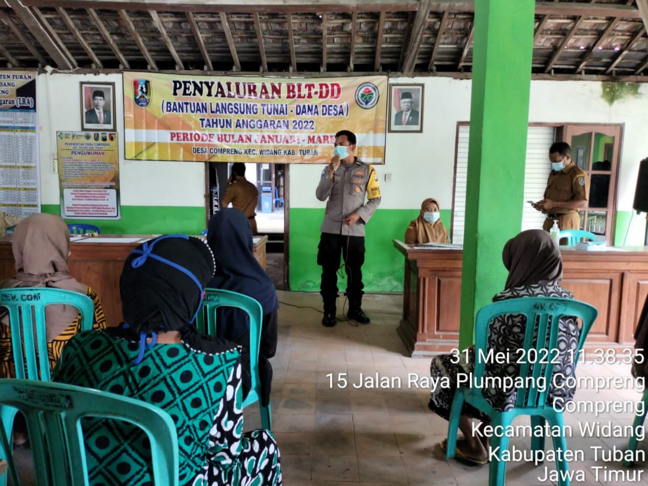 Widang – Maspolin.id// Untuk memastikan berjalannya penyaluran BLT-DD yang aman dan tertib, Bhabinkamtibmas Polsek Widang Desa Compreng Aipda Pamuji hadir dalam rangka melakukan pengamanan dan pendampingan. Kegiatan bertempat di Balai Desa Compreng Kecamatan Widang Tuban, Selasa (31/05/2022).
