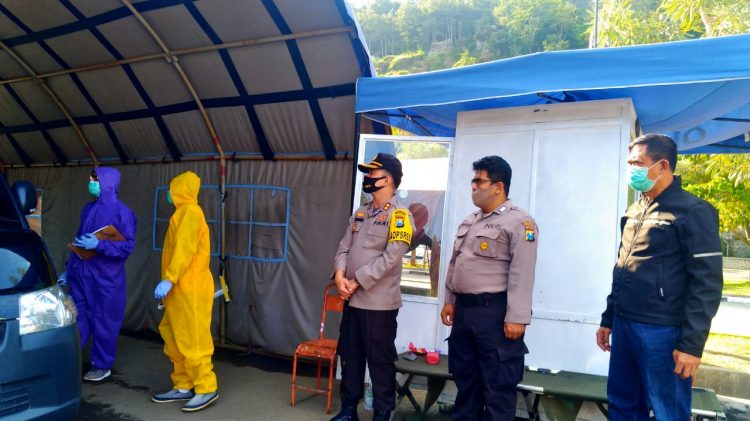 Didampingi oleh Kapolsek Tugu Iptu Supadi, S.H., AKBP Doni meninjau langsung proses pemeriksaan sesuai protokol kesehatan bagi orang, barang maupun kendaraan yang akan masuk ke Kabupaten Trenggalek. Mulai dari proses pemeriksaan suhu tubuh, pendataan, ruang isolasi hingga penyemprotan disinfektan.