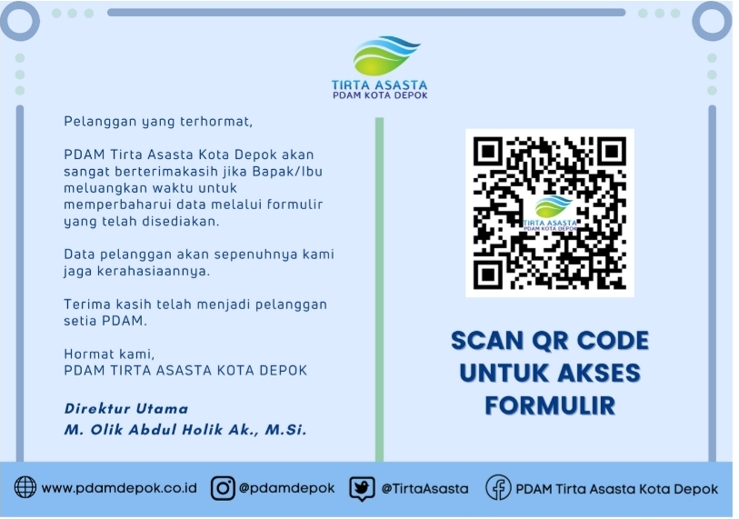 MASPOLIN.ID.-SUKMAJAYA, DEPOK- PDAM Tirta Asasta Kota Depok melakukan pemutakhiran data bagi pelanggan melalui Scan Barcode. Hal tersebut dikatakan Direktur Utama (Dirut) PDAM Kota Depok M. Olik Abdul Holik untuk meningkatkan dan mempermudah layanan pelanggan di era digital sekarang ini, berbagi informasi semakin mudah menggunakan teknologi.