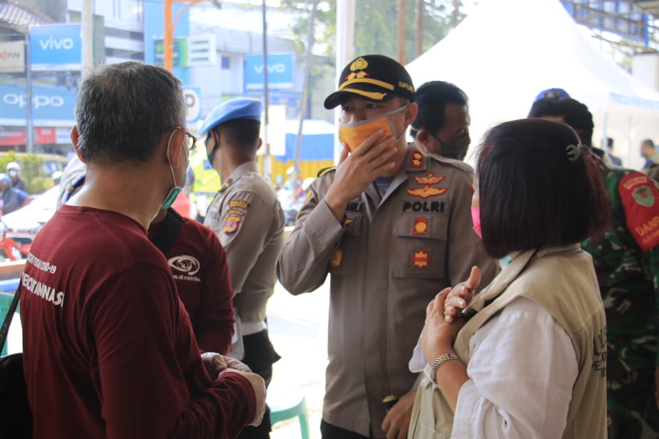 MASPOLIN.ID.-KARAWANG- Kapolres Karawang Polda Jabar AKBP Arif Racman Arifin melaksanakan pemeriksaan Swab terhadap pengunjung maupun pedagang di Pasar Johar Karawang oleh Gugus Tugas percepatan penanganan Covid-19 Kabupaten Karawang, Sabtu (13/06/2020).