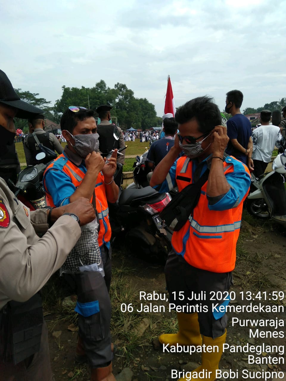 Personel Polres Pandeglang membagikan 700 masker kepada masyarakat yang mengikuti deklarasi tersebut, dalam rangka untuk selalu mendisiplinkan protokol kesehatan pencegahan Covid-19, Rabu, (15/07/2020)