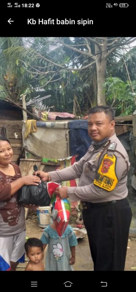 Bripka .M .Hafit Babinkamtibmas Polsek kota jambi secara spontan dan rasa kepeduliannya yang besar memberikan bantuan berupa sembako secara pribadi kepada kurang lebih sepuluh kepala keluarga di Rt 32 kelurahan simpang 3 sipin jambi yang di dampingin oleh tokoh masyarakat dan karang taruna, sekaligus bersama ketua Rt 32 walaupun dengan pemberian yang sangat terbatas tetapi setidaknya Bripka M.Hafit . sudah berbuat yang terbaik selain tidak pernah dapat bantuan selama wabah Covid 19 warga yang di bantu benar-benar tidak mampu bahkan tanah yang di tempati adalah kepunyaan orang lain ( Numpang ) . sesuai tugasnya sebagai Babinkamtibmas simpang 3 sipin Jambi Bripka.M.Hafit sangat mengetahui kondisi warganya salah satu yang bernama keluarga Alm Kasiran dan menantunya Mujiono. dimana biasa hidupnya hanya memelihara kambing yang dititipkan warga yang selama ini peduli dan berharap dari kambing yang berkembang biak ,hidupnya sangat memperihatikan sekali .