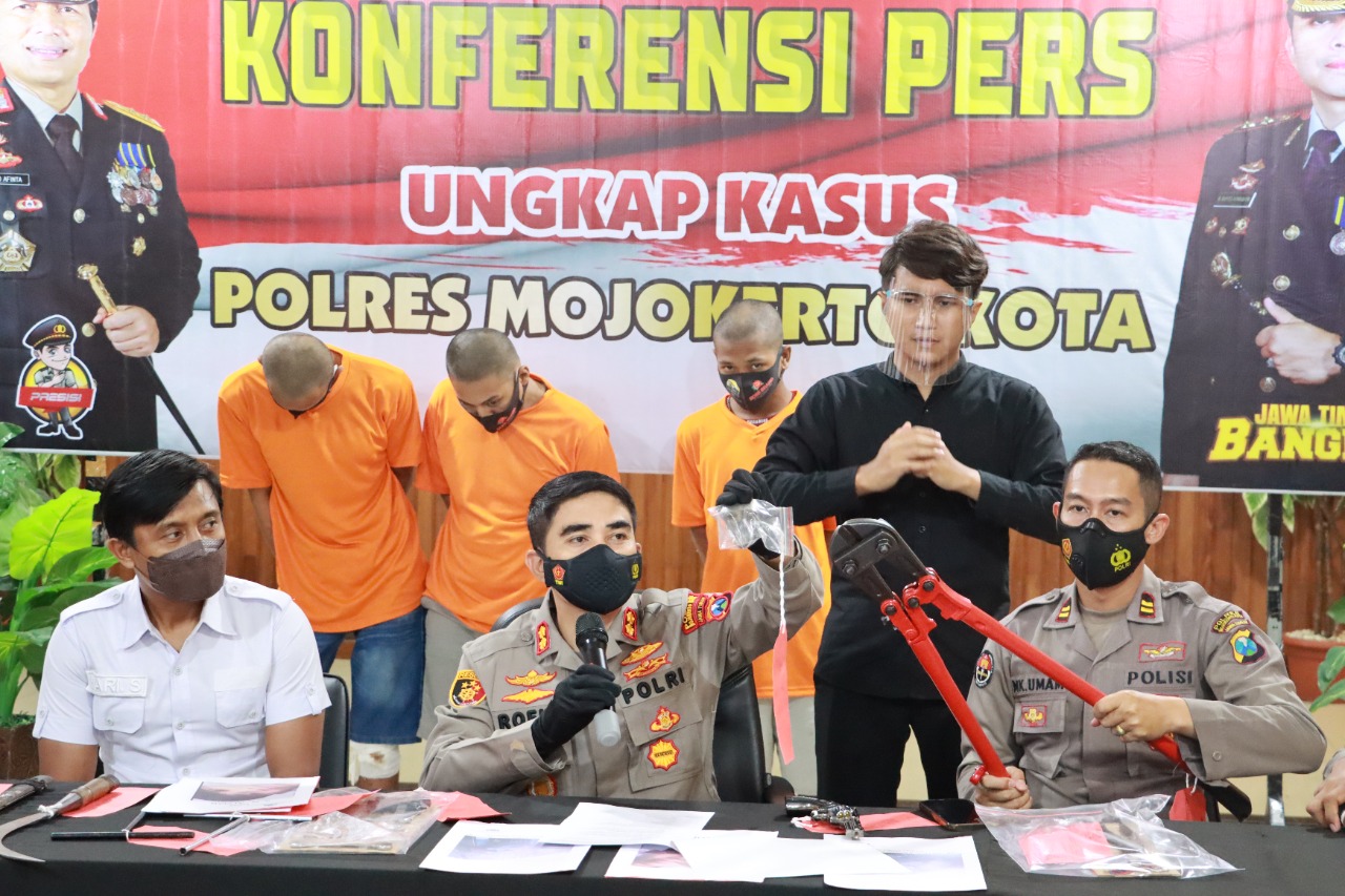 Kamis (3/2/2022) sekira pukul 04.30 WIB, Unit Resmob Satreskrim Polresta Mojokerto sedang melaksanakan kring dan mengetahui ada tiga orang yang mencurigakan di depan PT Ajinomoto Jalan Raya Desa Mlirip Kecamatan Jetis, Kabupaten Mojokerto.