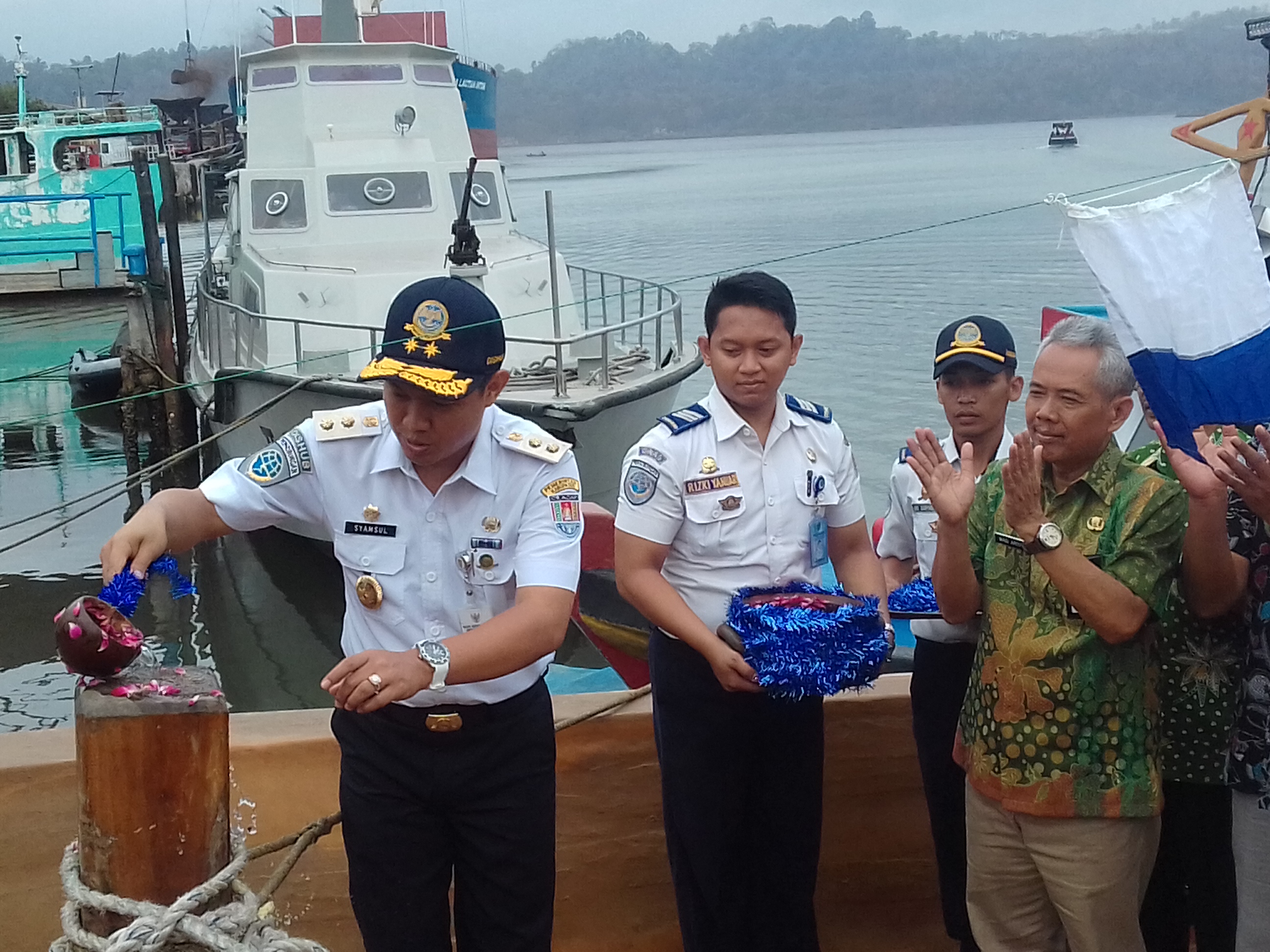 Sebelum berlayar, Wabup menyiramkan air kembang ke kapal tersebut, dan diikuti para Asisten Sekda, yaitu Dian Setyabudi, Wasi Ariyadi, U’ong Suparno, dan Tulus Wibowo.