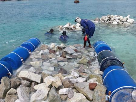 Mustajab menjelaskan, pemasangan bronjong di sisi timur Pulau Karya dimulai sejak 12 Agustus 2024 dengan mengerahkan sebanyak 10 personel Pasukan Biru.