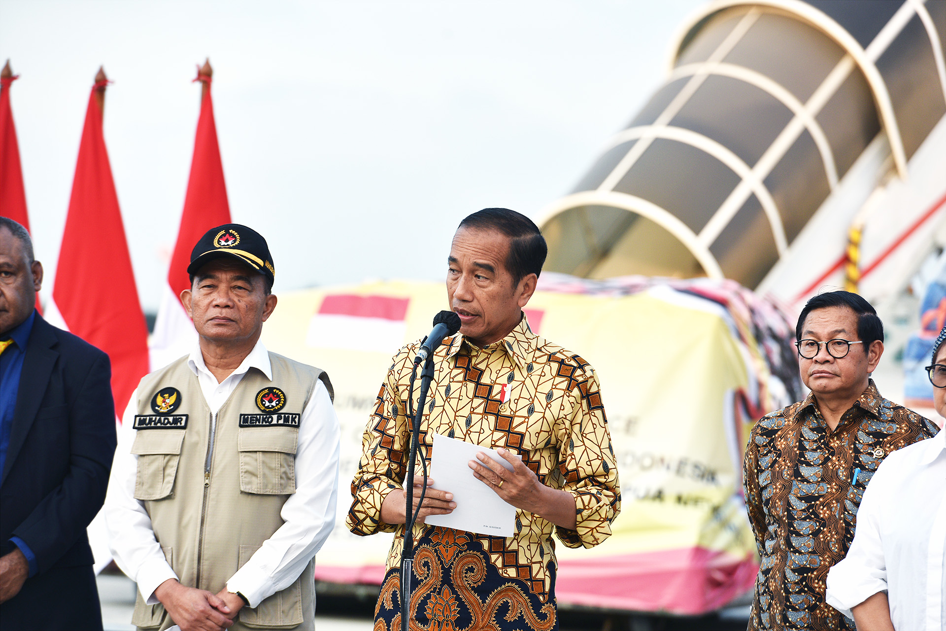 Turut hadir dalam pelepasan bantuan tersebut yaitu Menteri Koordinator Bidang Pembangunan Manusia dan Kebudayaan Muhadjir Effendy, Menteri Luar Negeri Retno Marsudi, Menteri Kesehatan Budi Gunadi Sadikin, Sekretaris Kabinet Pramono Anung, Panglima TNI Jenderal Agus Subiyanto, Kapolri Jenderal Listyo Sigit Prabowo, Ketua Komisi VIII DPR RI Ashabul Kahfi, Wakil Duta Besar Papua Nugini Gregory Hombuahin, dan Head of Delegation IFRC Jakarta Office Elkhan Rahimov.