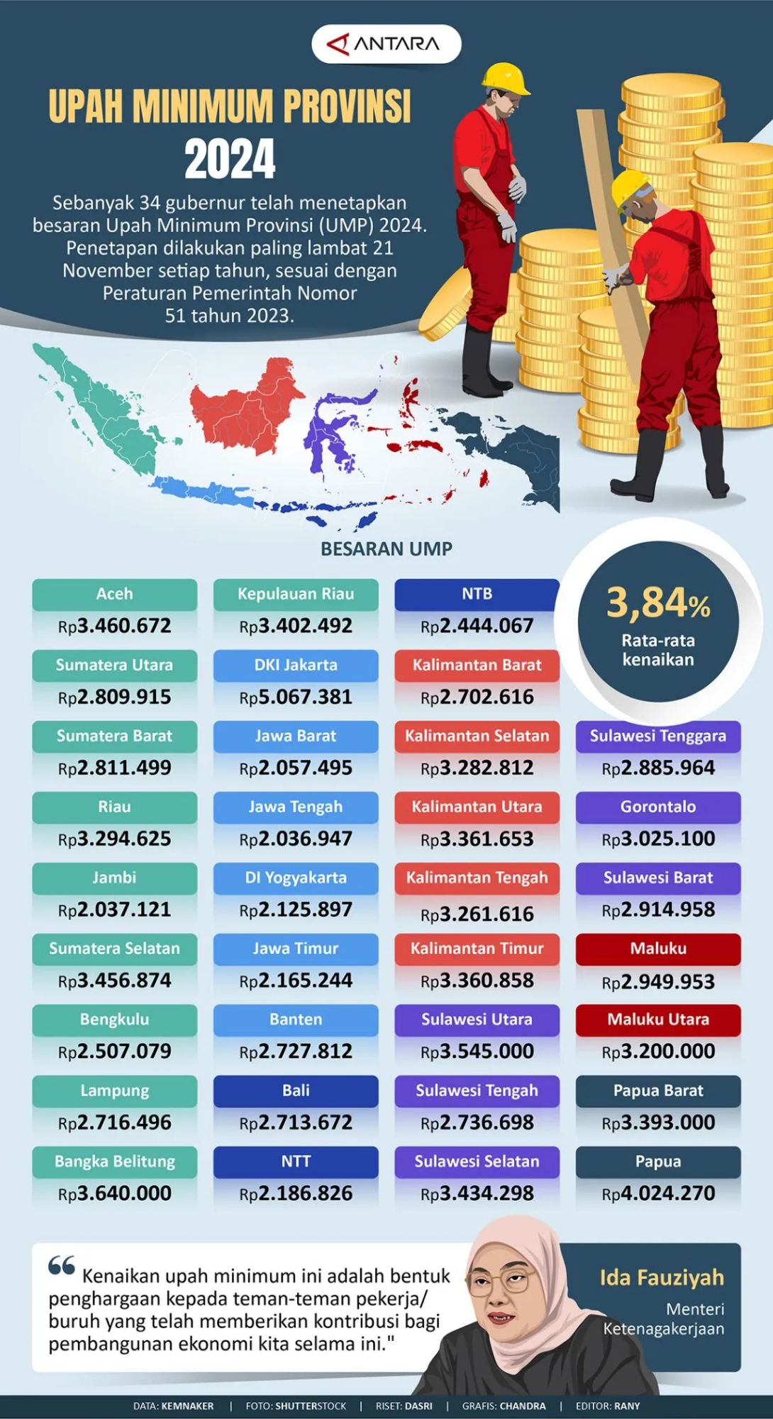 Pada tahun sebelumnya, Pemerintah Provinsi (Pemprov) Jakarta menetapkan UMP 2024 sebesar Rp5.067.381. Angka ini naik 3,38 persen atau Rp165.583 dibandingkan 2023.