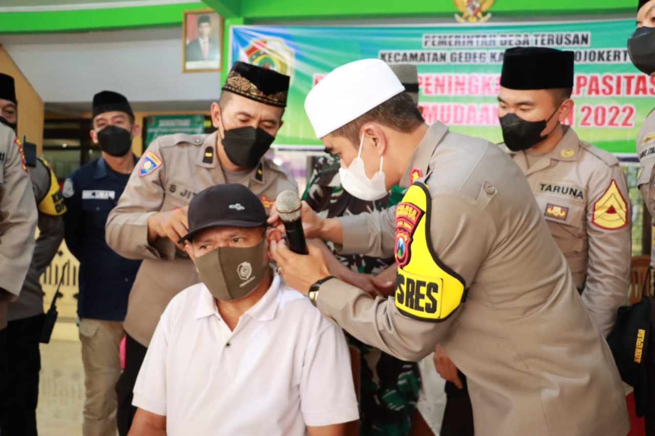 Pemberian bakti sosial alat pendengaran dan sembako kepada Bapak Julianto disaksikan Camat Jetis, Kepala Desa Mojorejo serta PJU Polresta Mojokerto dan Taruna AKPOL TK II Angkatan 55 Batalyon Satya Dharma serta Siswa Bintara SPN Polda Jatim di Balai Desa Terusan. (MK/RK)