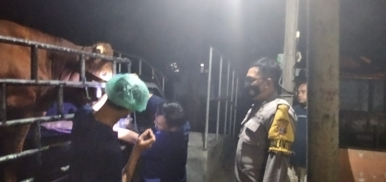 Babhinkamtibmas Kelurahan Kedundung Bripka Tris Dhita P.N,S.H, bersama dokter hewan UPT RPH Drh. Hendra Hidayatullah, petugas AMPM UPT RPH Bpk. Yunarno, petugas Potong Hewan Ternak UPT RPH hadir dan melakukan pengecekan langsung terhadap hewan yang akan disembelih.