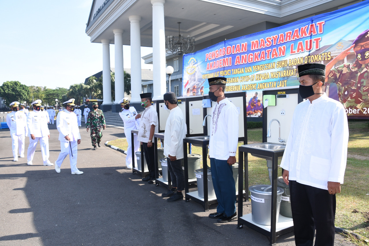 MASPOLIN || Surabaya – Dalam rangka pengabdian kepada masyarakat, Gubernur Akademi Angkatan Laut (AAL) Laksamana Muda TNI Edi Sucipto, S.E., M.M. menyerahkan alat pencuci tangan dan alat pengecek suhu badan otomatis kepada masyarakat yang digelar di Lapangan Banda, Kesatrian AAL Bumimoro, Surabaya, Senin (5/10).