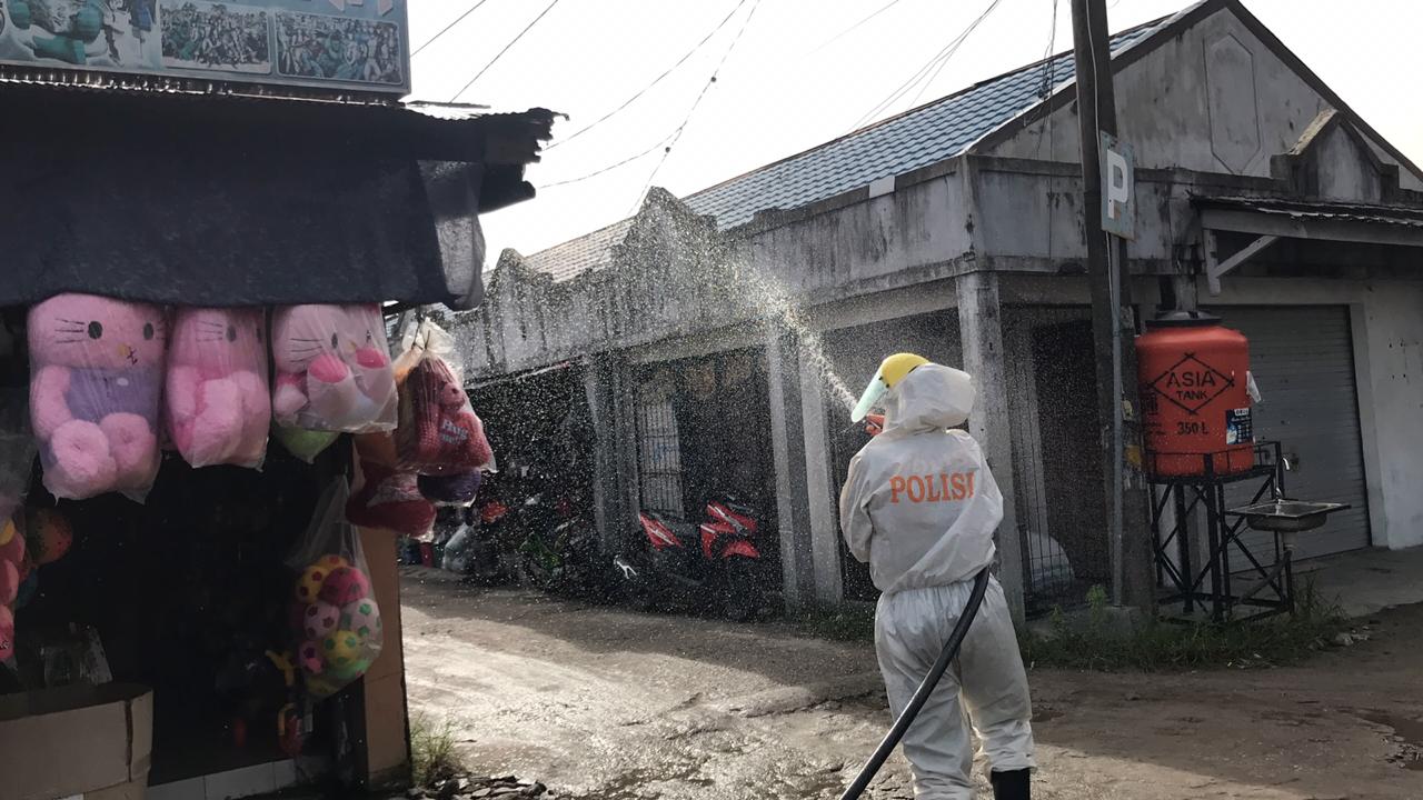 Kali ini, personel Polisi yang banyak bertugas di lapangan tersebut, menyemprotkan cairan disinfektan di seputaran Jalan Rajawali, Jalan Seth Adji dan A Donis Samad Kota Palangka Raya, Minggu (12/07/2020).