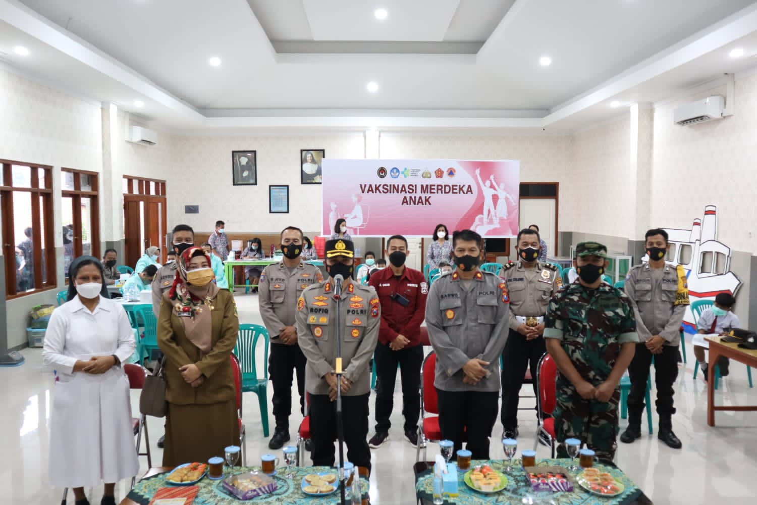 Kapolresta Mojokerto Bersama stackholder mengikuti zoom meeting dari lokasi Vaksinasi Merdeka Anak di SD Katolik Wijana Sejati Jl. Pemuda No.31 Kel. Gedongaan Kec. Magersari Kota Mojokerto
