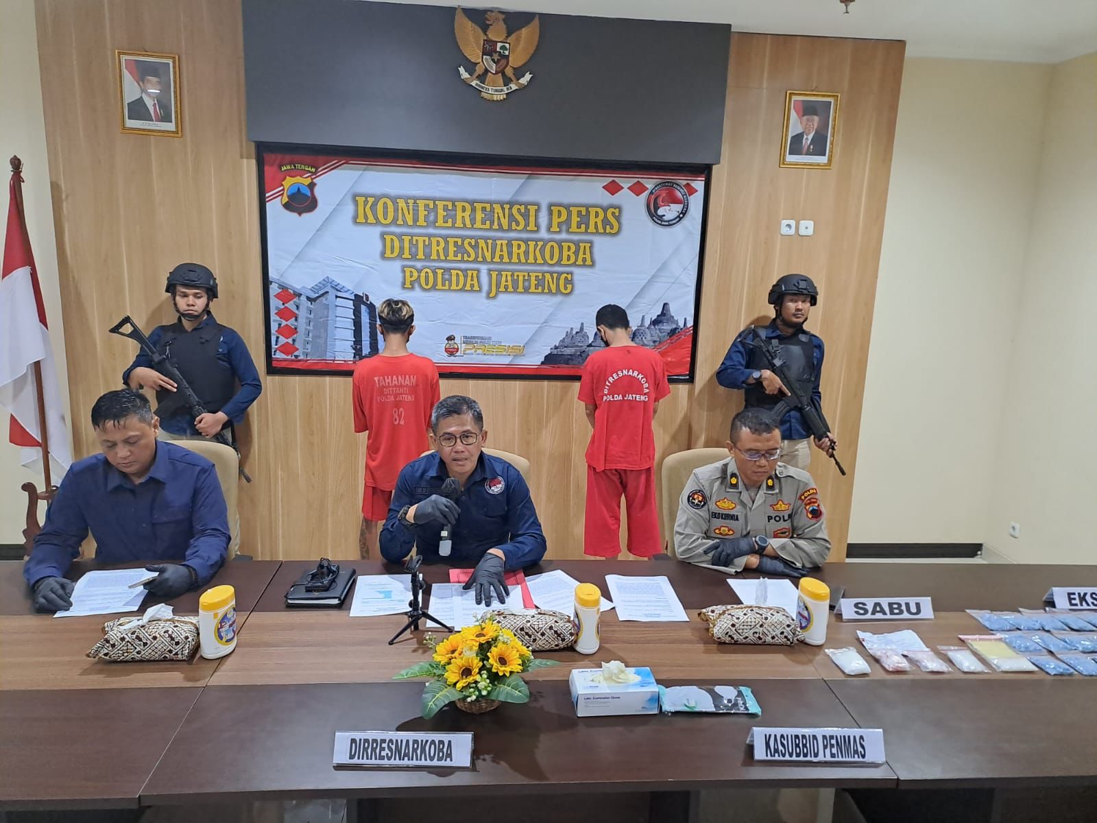 “IA ditangkap dengan barang bukti 3.256,5 butir ekstasi. Sementara SK ditangkap dengan barang bukti 226,72 gram sabu. Kami ungkap satu minggu yang lalu,” ungkap Dirresnarkoba Polda Jateng Kombes. Pol. Lutfi Martadian, S.I.K., S.H., M.H., di Mapolda Jateng, Senin (17/7/23).