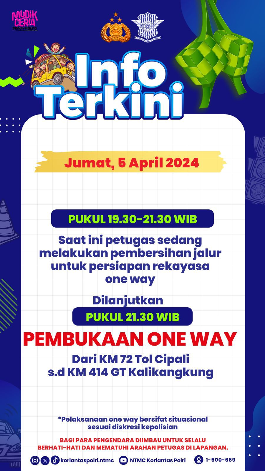 JAKARTA – Maspolin.id|| Pelaksanaan rekayasa lalu lintas arus mudik one way alias satu arah menuju timur akan dimulai Jumat (5/4/2024) pukul 21.30. One way diberlakukan di KM 72 Tol Cipali hingga KM 414 Gerbang Tol Kalikangkung, Semarang, Jawa Tengah.