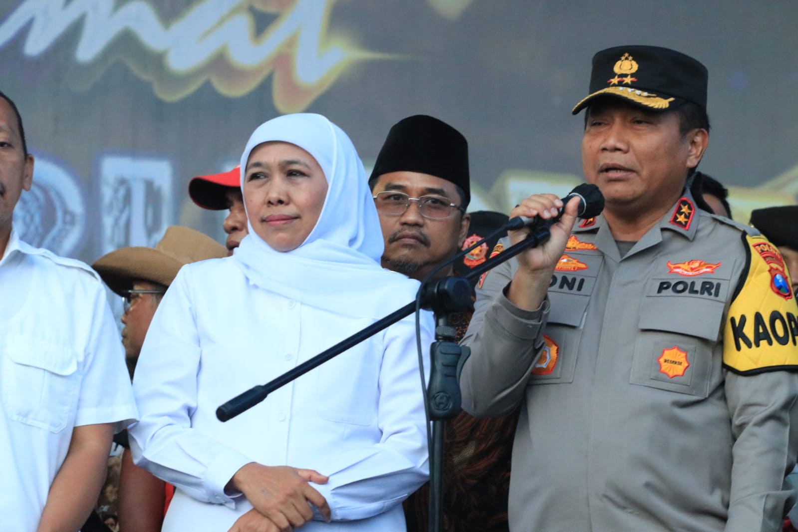 Dalam aksi tersebut, masa dari ribuan buruh ditemui oleh Gubernur Jawa Timur Khofifah Indar Parawansa didampingi oleh Kapolda Jatim Irjen Pol.Dr. Toni Harmanto,M.H.