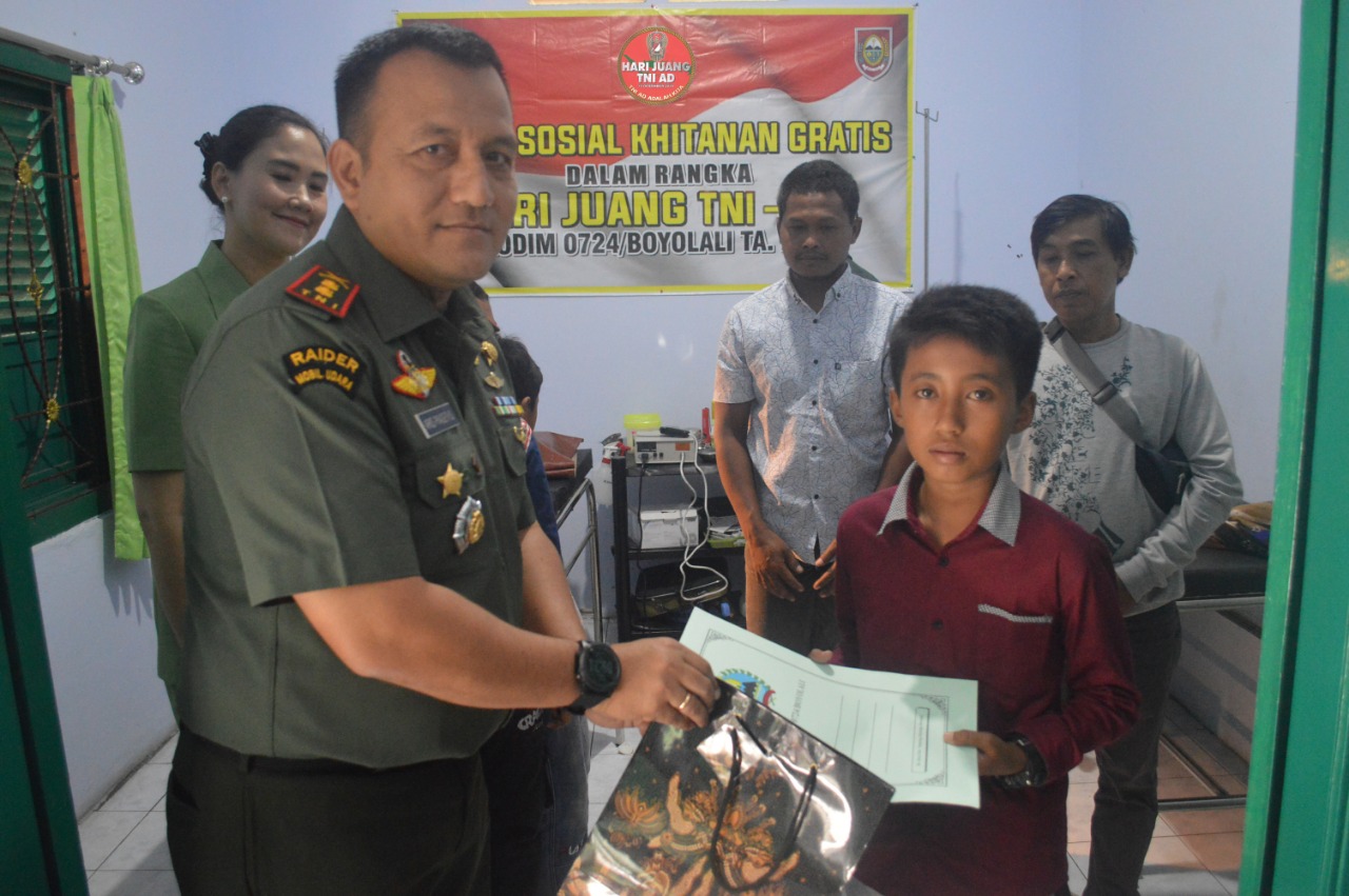 “Khitan gratis yang dilaksanakan di Klinik Pratama Kartika 24 Boyolali sebagai bagian penyiapan generasi penerus bangsa yang senantiasa bertaqwa kepada Tuhan Yang Maha Esa dan selalu menjaga kesehatan secara perorangan.Kegiatan ini setidaknya mampu meringankan beban warga kurang mampu,” ungkap Perwira Seksi Teritorial Kodim 0724/Boyolali Kapten Inf Kamami.
