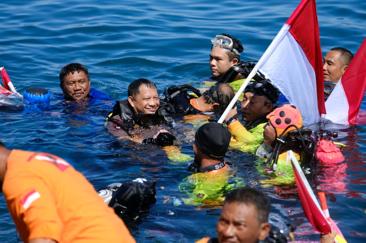 “Kita tetap setia tetap setia. Mempertahankan Indonesia. Kita tetap setia tetap setia. Membela negara kita,” bunyi penggal lagu yang ikut dinyanyikan dengan bergelora oleh para penyelam di permukaan.