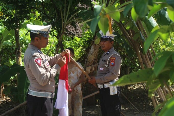 Ya, kehadiran para Polantas ini ternyata bermaksud untuk membagikan bendera merah putih kepada warga. Bukan itu saja, mereka bahkan membantu mencari tiang dan memasang bendera hingga berkibar di depan rumah warga.