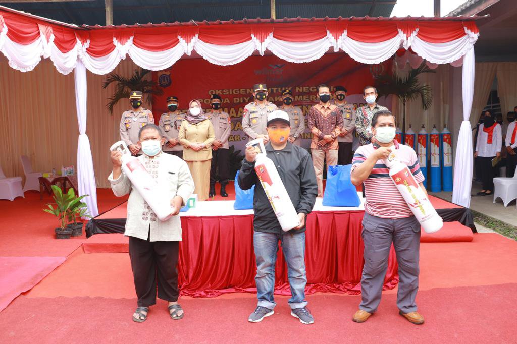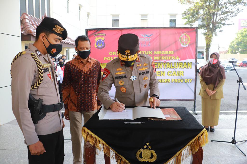 Kapolda DIY Irjen Pol Drs. Asep Suhendar didampingi para PJU Polda DIY dengan disaksikan Kepala Dinkes DIY drg. Pembajun Setyaningastutie, M.Kes menerima penyerahan 12 ton oksigen cair yang segera didistribusikan ke 4 rumah sakit besar di Yogyakarta, masyarakat Kulonprogo, Sleman dan kota Yogyakarta.