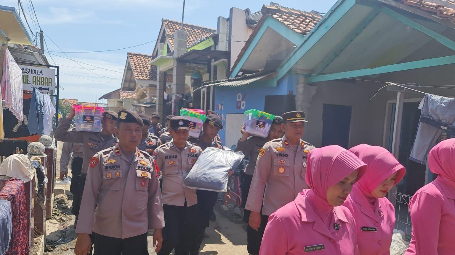 Indramayu – Maspolin.id|| Kapolres Indramayu Polda Jabar AKBP Dr. M. Fahri Siregar, S.H., S.I.K., M.H., yang diwakili oleh Kapolsek Juntinyuat Iptu Trio Tirtana. H., S.H., bersama dengan Bhayangkari Ranting Juntinyuat Cabang Indramayu, menyalurkan bantuan sosial kepada warga masyarakat yang terdampak Bencana Angin Puting Beliung di Blok Karangpandan Desa Juntinyuat, Sabtu (6/1/24).