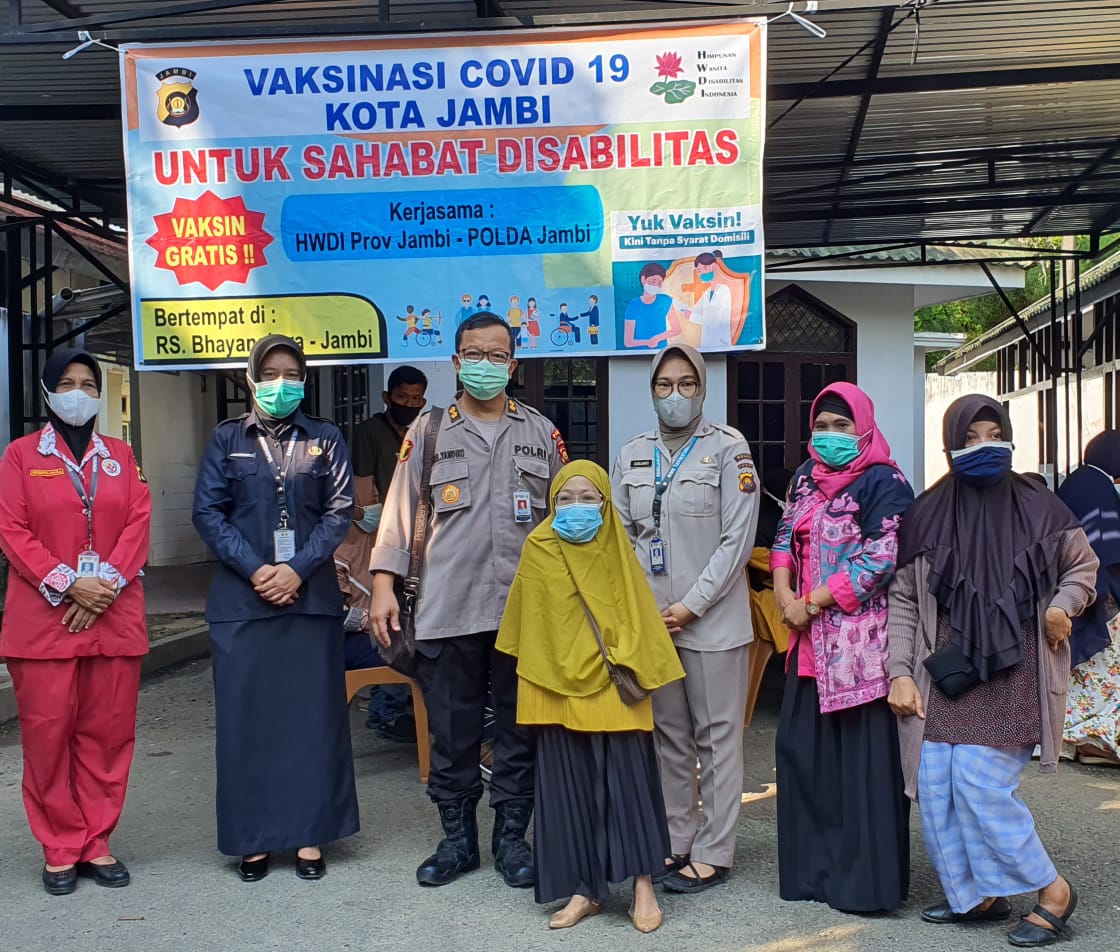 Kapolda Jambi Irjen Pol A Rachmad Wibowo, SIk melalui Kabid Humas Polda Jambi Kombes Pol Mulia Prianto, S.Sos, SIk saat dikonfirmasi membenarkan bahwa hari ini telah dilaksanakan vaksinasi massal untuk Sahabat Disabilitas Provinsi Jambi yang bertempat di RS Bhayangkara Polda Jambi dan mengapresiasi penyandang Disabilitas yang mau datang untuk melaksanakan vaksinasi ini.