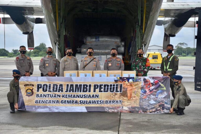 Jambi, Maspolin.id—Wakapolda Jambi, Brigjen Pol. Yudawan R melepas bantuan sosial (Bansos) Polda Jambi Peduli Bencana Gempa Bumi di Sulawesi Barat (Sulbar) dan Banjir di Kalimantan Selatan (Kalsel).
